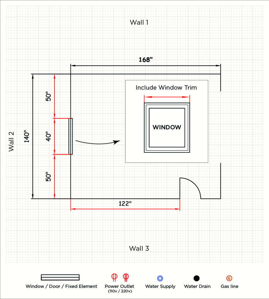 Now, locate the permanent fixtures in the room. Measure from the wall corner to the outside edge of the casing (trim) of the window or door. Mark this clearly on your layout.