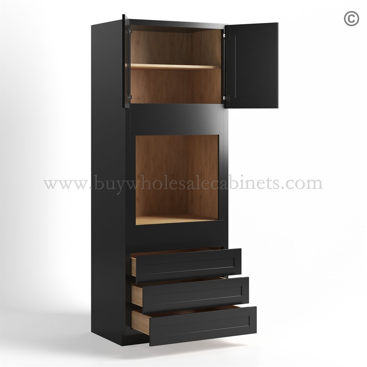 Our Black Shaker 30 W Oven Pantry Cabinet is 30″ Wide, 24″ Deep, and available in 3 heights. This cabinet features two doors, one large open shelf, and three bottom drawers. This cabinet Black will fit perfectly in your kitchen or bathroom. The brilliant shade of shaker Black cabinet will make your rooms exude modernity and quality.