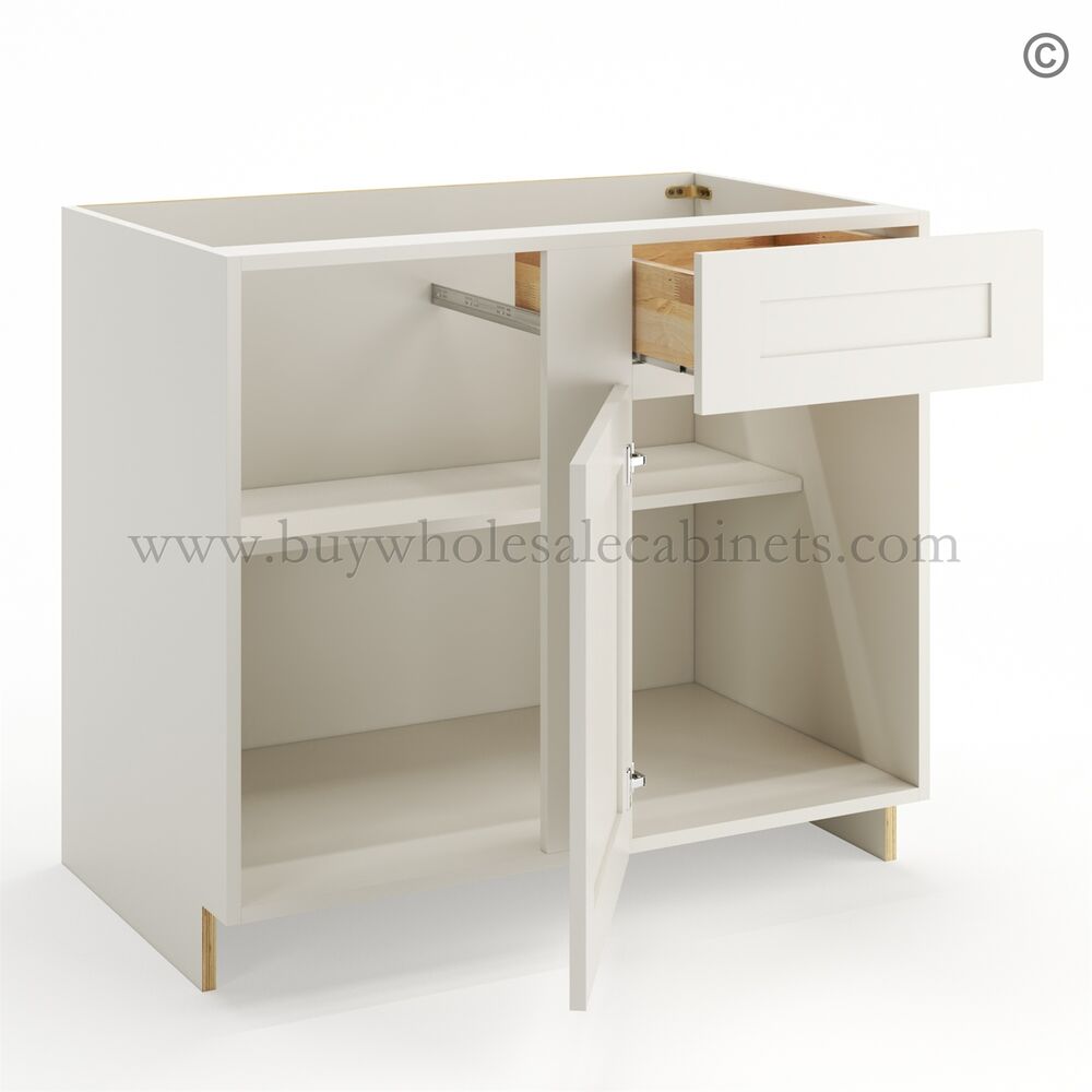 Pearl White Base Blind Cabinet is 34-1/2″ tall, 24″ deep, and available in three widths (39″, 42″, 45″).