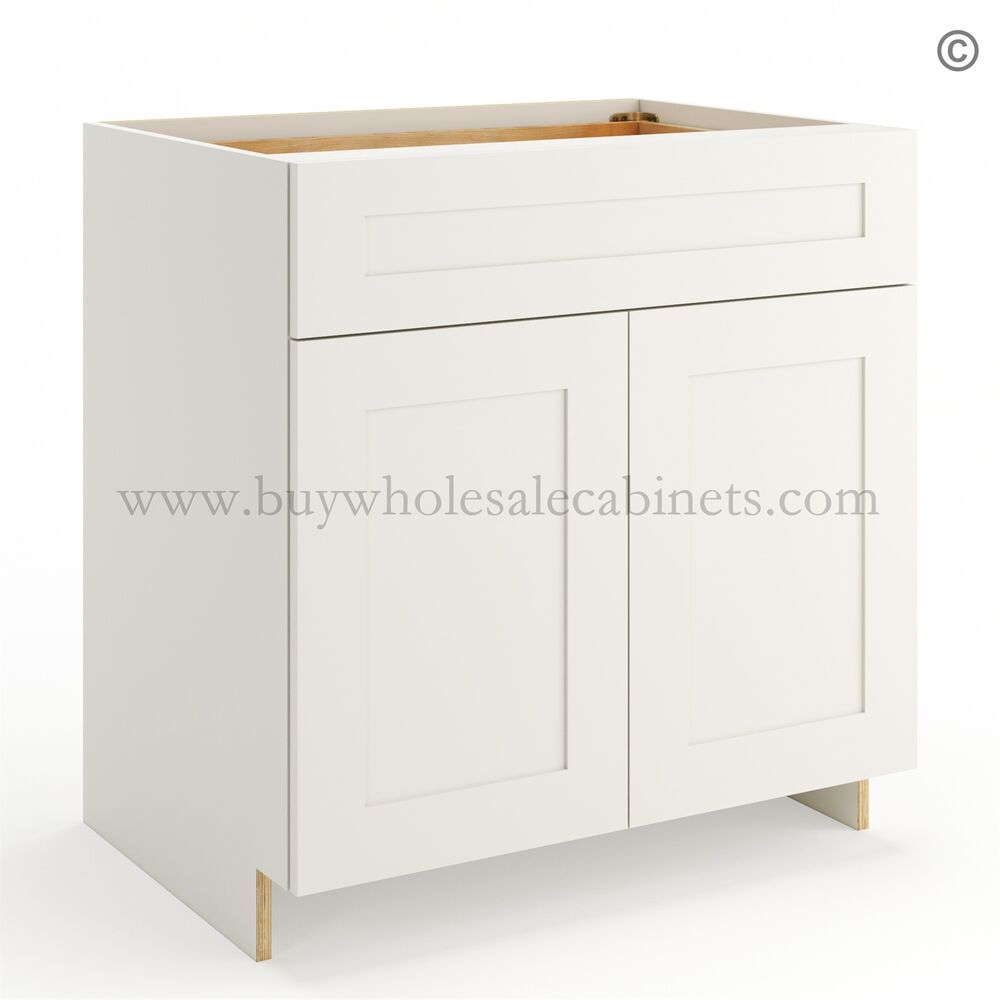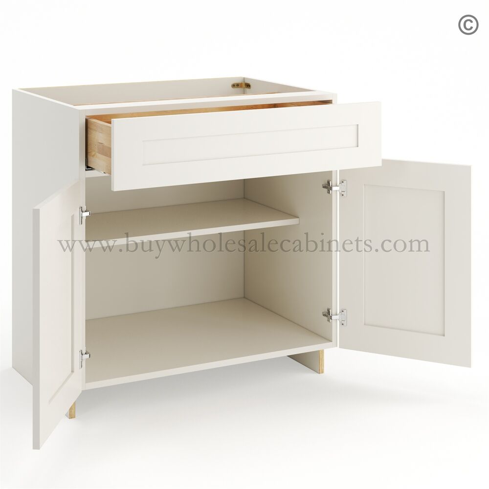 Pearl White Base Cabinet with 1 Drawer, 2 Doors, and Shelf is 34-1/2″ tall, 24″ deep, and available in seven widths (24″, 27″, 30″, 33″, 36″, 39″, 42″).