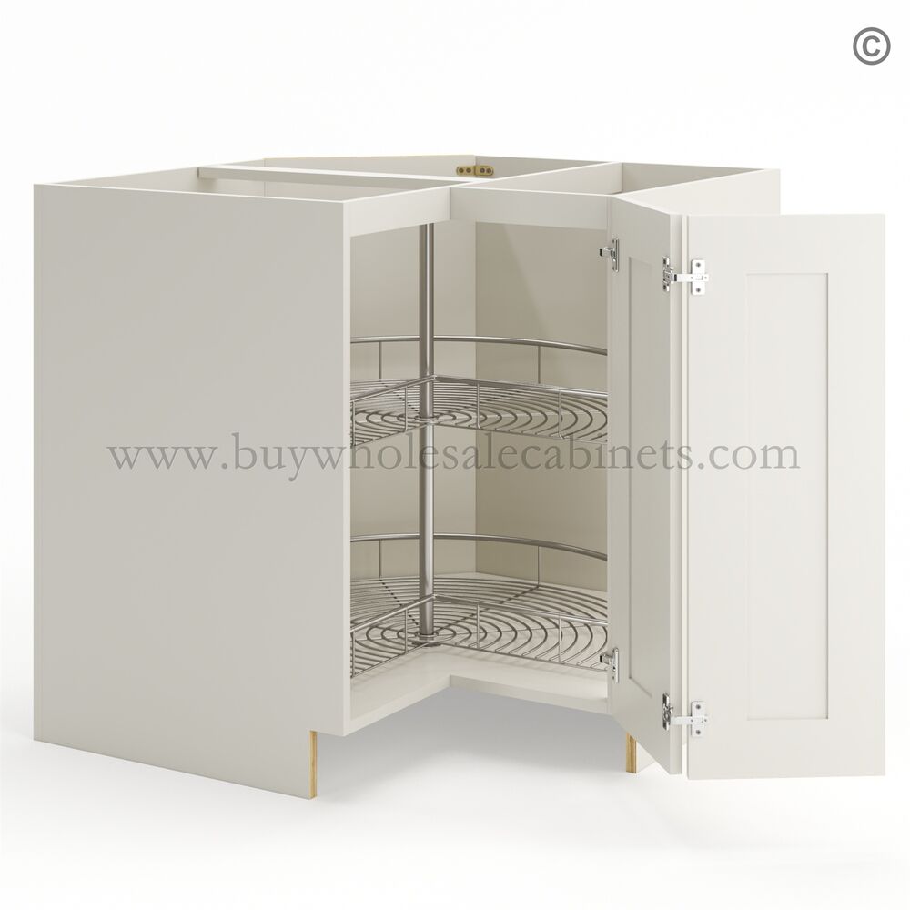 Frameless Pearl White Base Cabinet With Metal Lazy Susan, Folding Doors