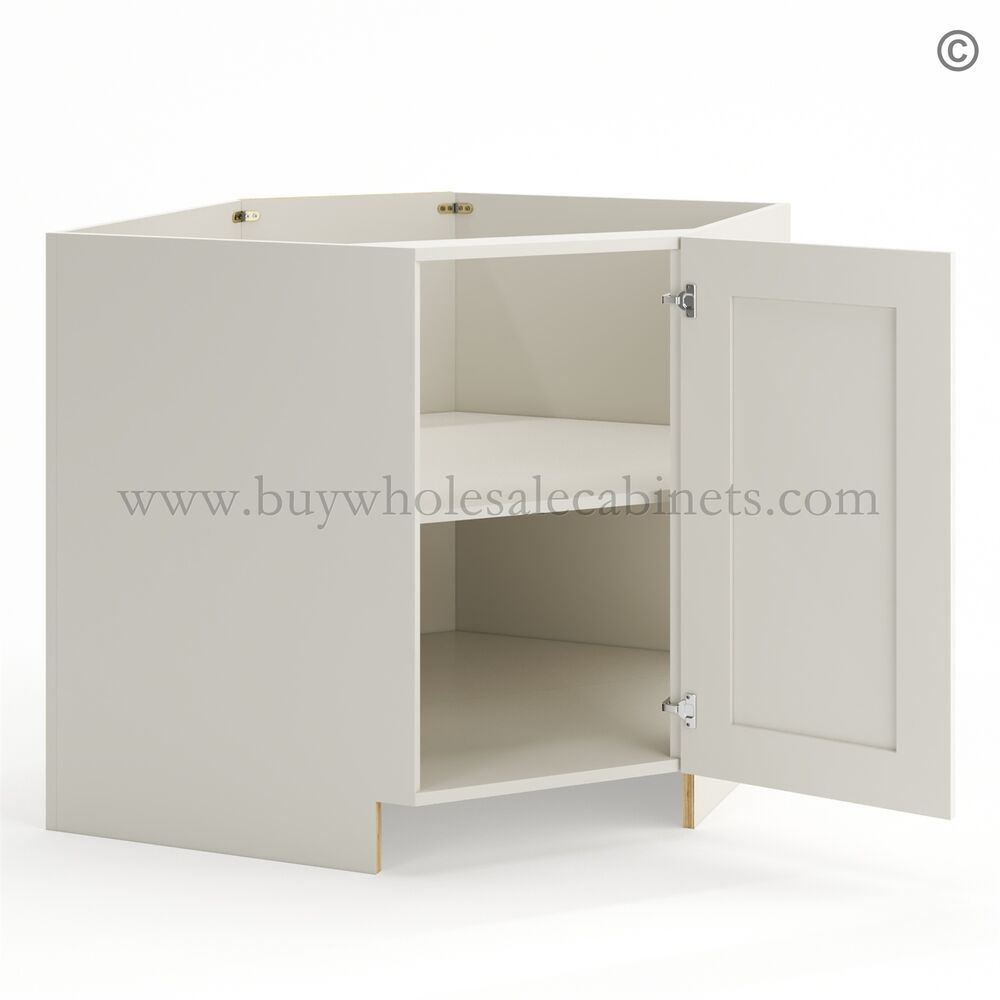 Pearl White Base Diagonal Cabinet 1 Door (Excludes Metal Lazy Susan Insert) s 34-1/2″ tall, 24″ deep and 36″ wide.