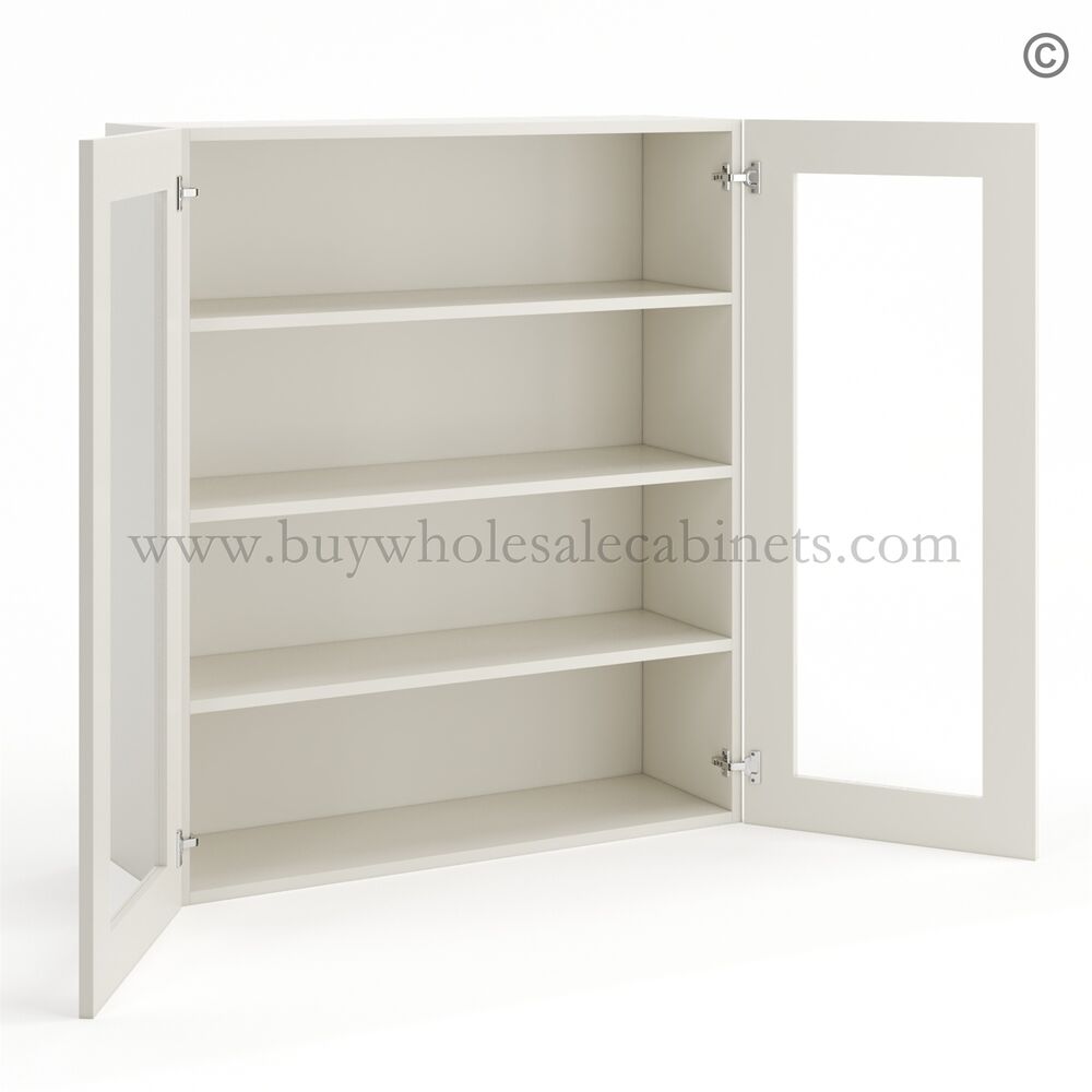 Be the first to review “Frameless Pearl White Wall Mullion Door 42″H – 2 Door 3 Shelves – Glass And Clips Not Included.” Cancel reply