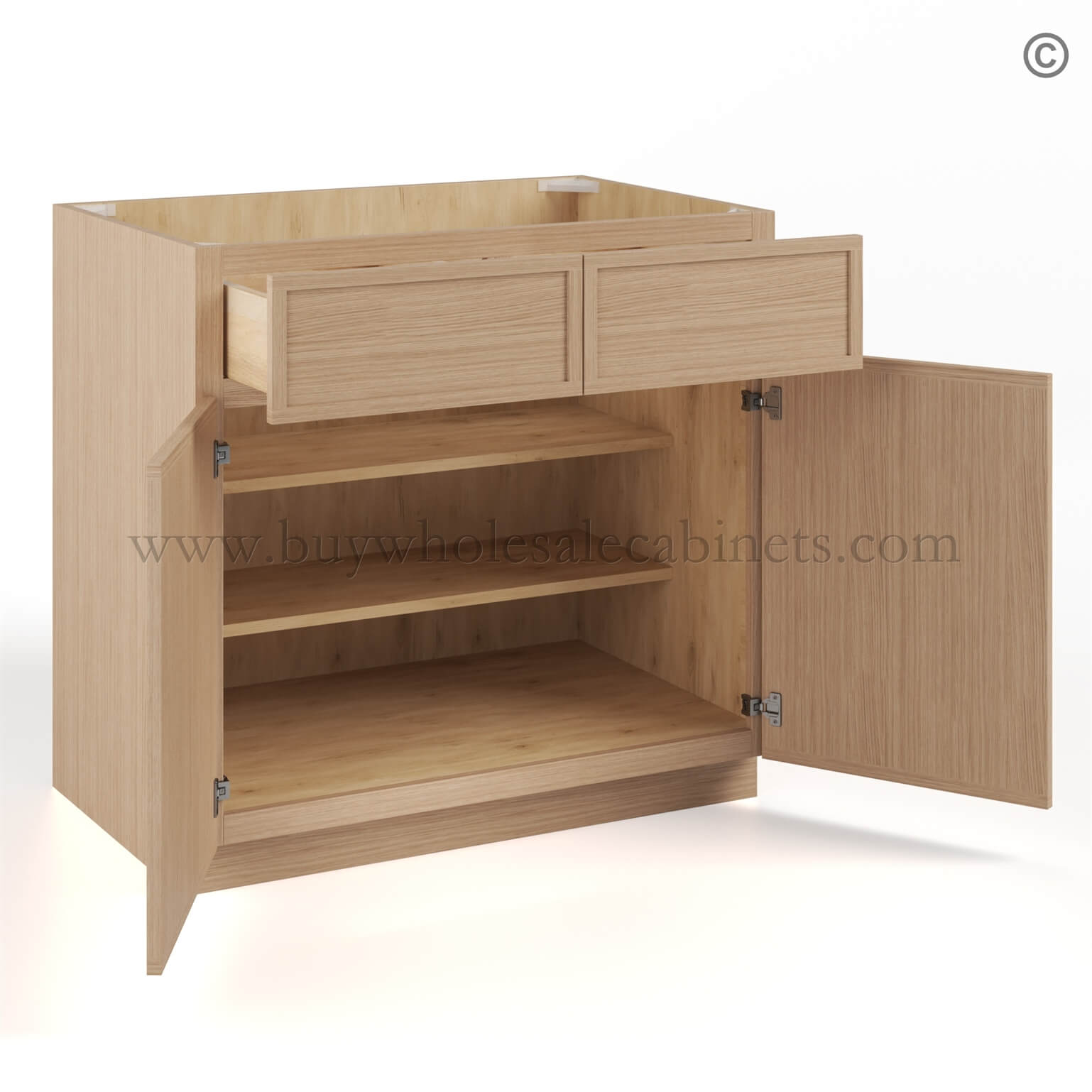 This RTA cabinet oak base double doors and drawers will complete your kitchen! Design your perfect kitchen and check out our selection of slim oak RTA cabinets.