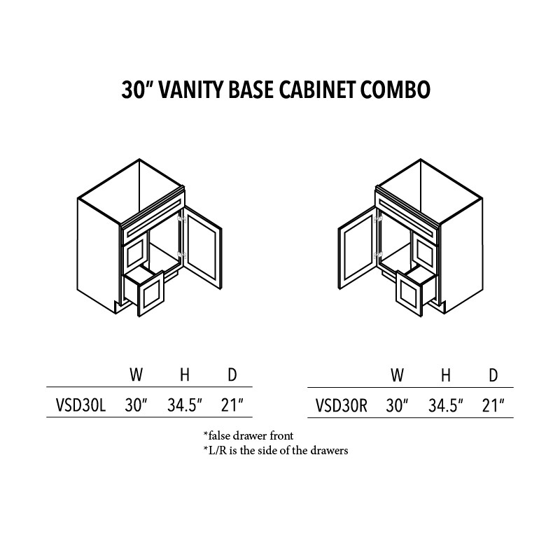 | Size | 30″W x 34.5″H x 21″D, Drawers Left – 30″W x 34 1/2″ x 21″D, Drawers Right – 30″W x 34 1/2″ x 21″D |