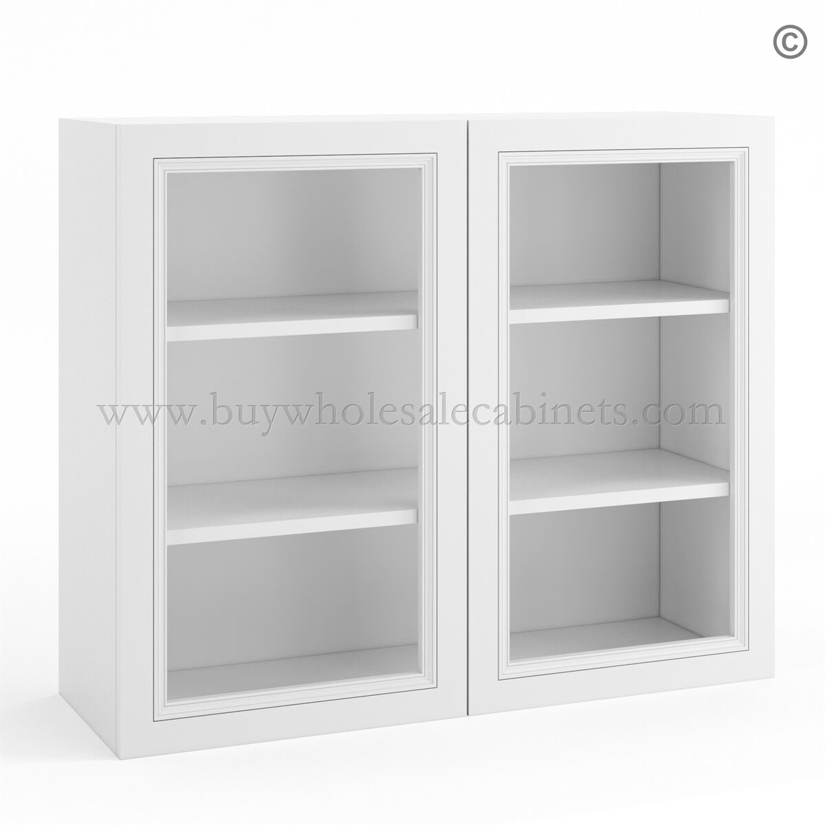 Frameless Pearl White Wall Mullion Door 30″H – 2 Door 2 Shelves – Glass And Clips Not Included.