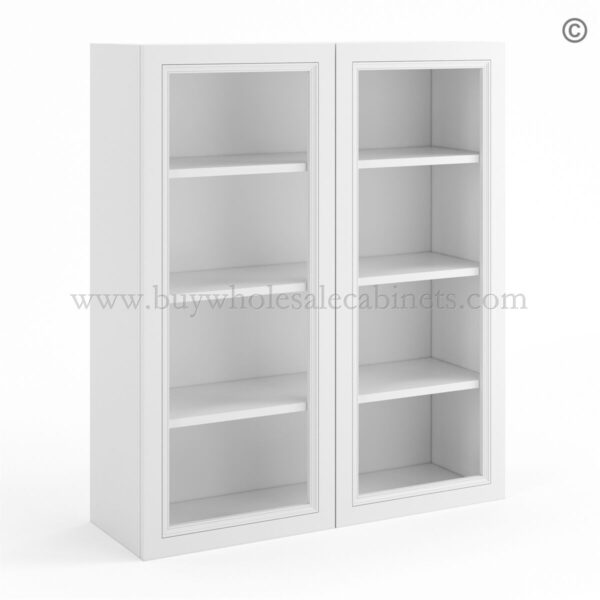 Frameless Pearl White Wall Mullion Door 42″H – 2 Door 2 Shelves – Glass And Clips Not Included.